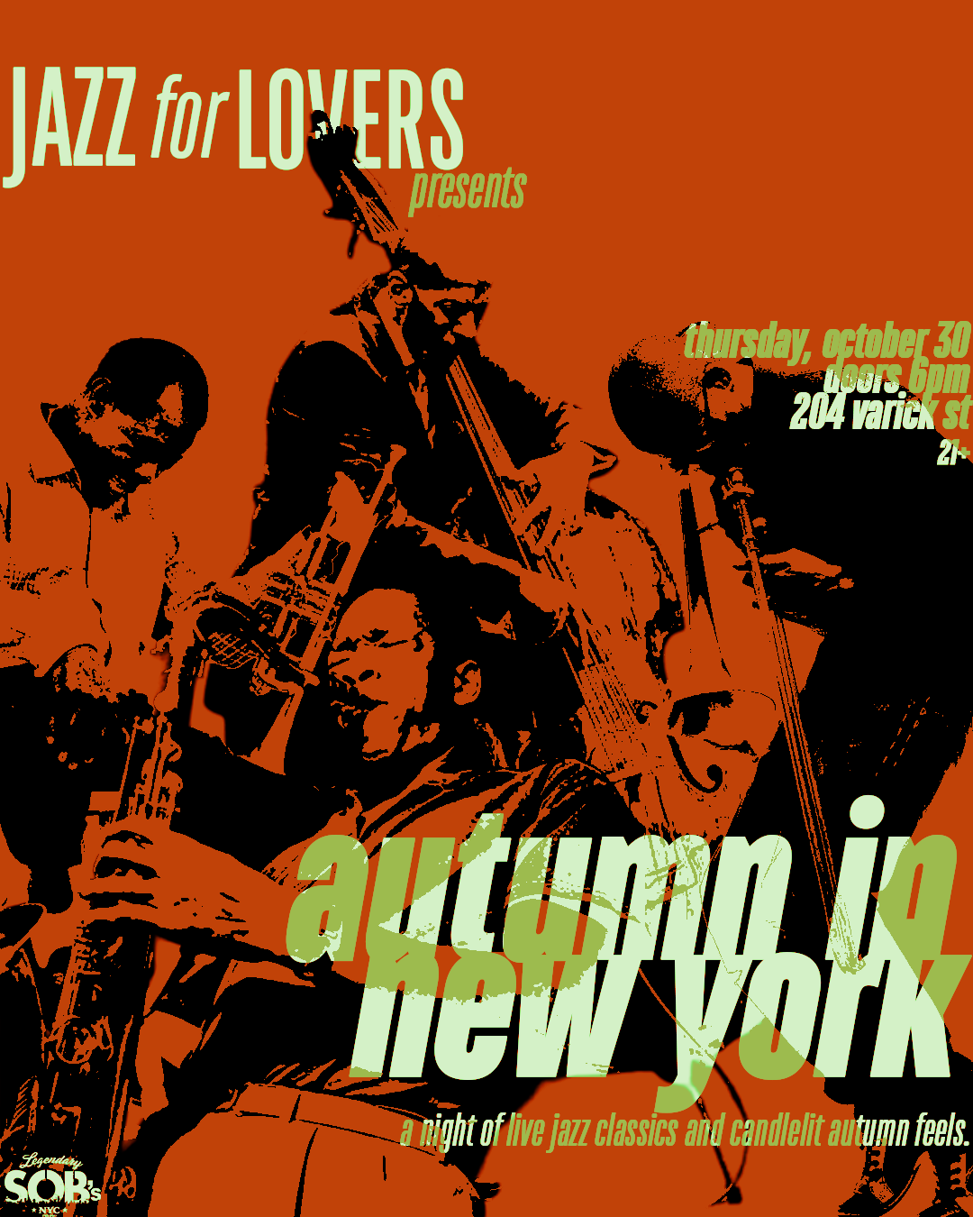 Jazz For Lovers Presents AUTUMN IN NEW YORK: a night of live jazz classics and candlelit autumn feels, the night before Halloween. A brand-new pop-up in Soho, only at SOB’s!